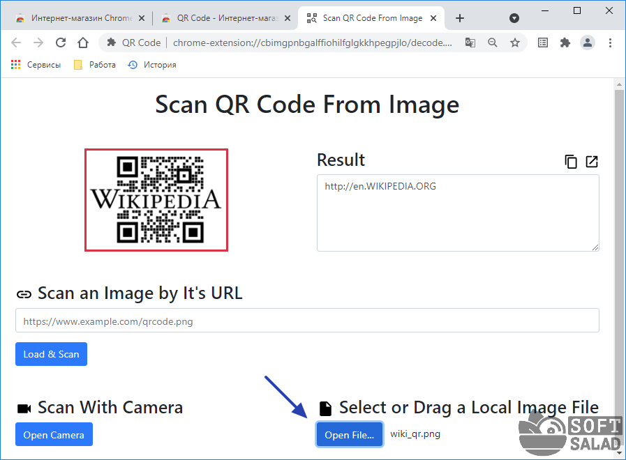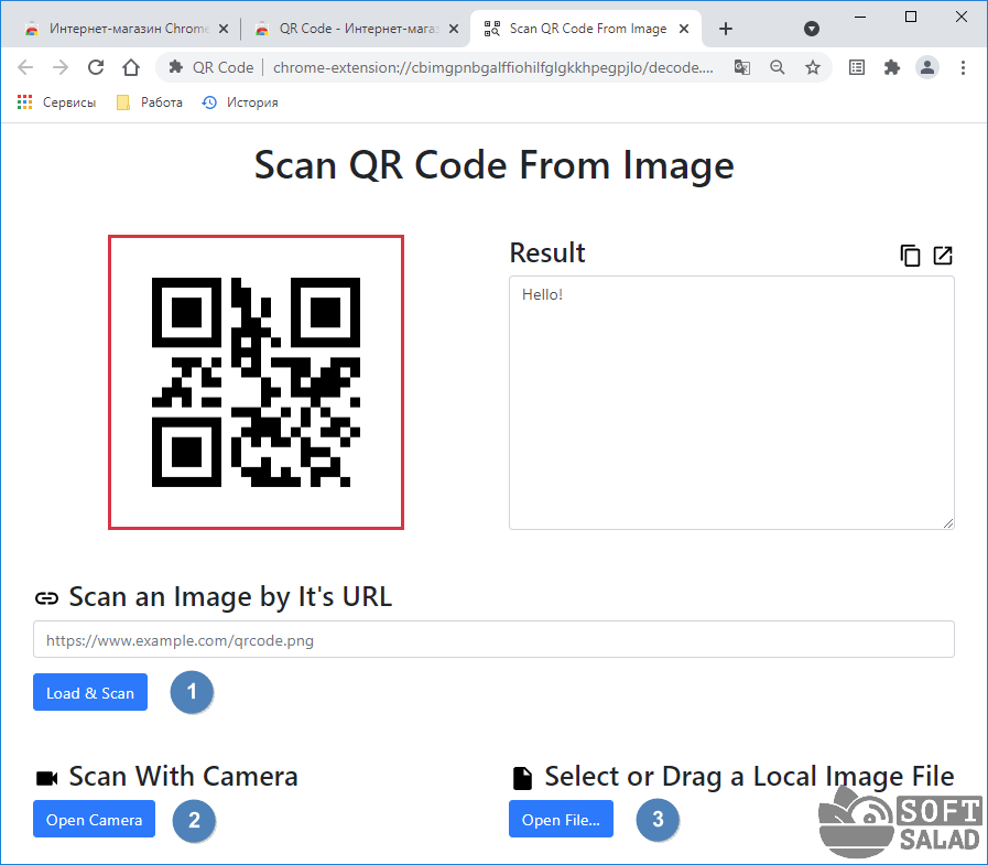 В браузере откроется новая вкладка. Здесь можно выбрать один из трех способов сканирования QR-кода: