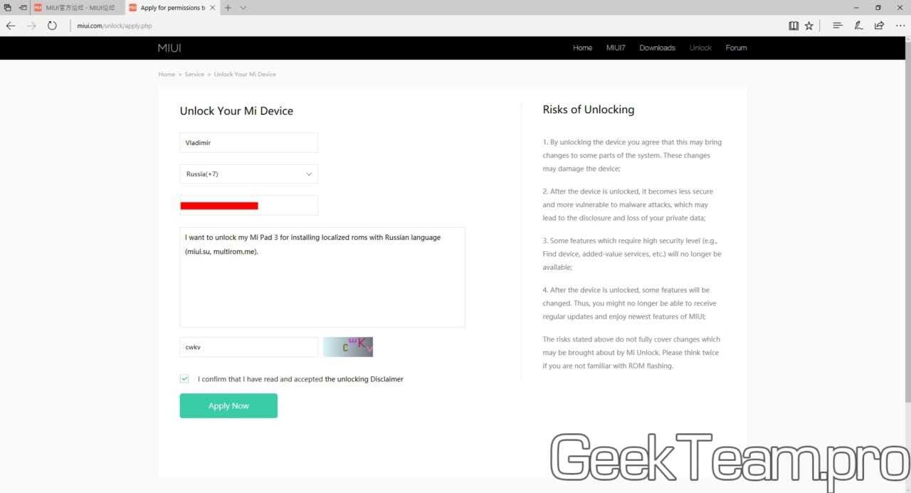 Попадаем на вот такую страницу, где нам нужно заполнить все поля. Имя и номер телефона (его нужно водить в десятизначном виде 933*******) это понятно, а вот в поле Reason нужно писать причину, почему вы хотите получить разрешение на английском языке. Просто копировать причины откуда-то не вариант, вам откажут и придётся создавать новый аккаунт. Поэтому просто откройте Google.Translate и напишите почему лично вы хотите разблокировать загрузчик. Перевода автоматического переводчика будет достаточно, чтобы модератора Xiaomi вас поняли и с большой долей вероятности вы получите разрешение. Вводим защитный код и ставим галочку внизу. Жмём Apply Now
