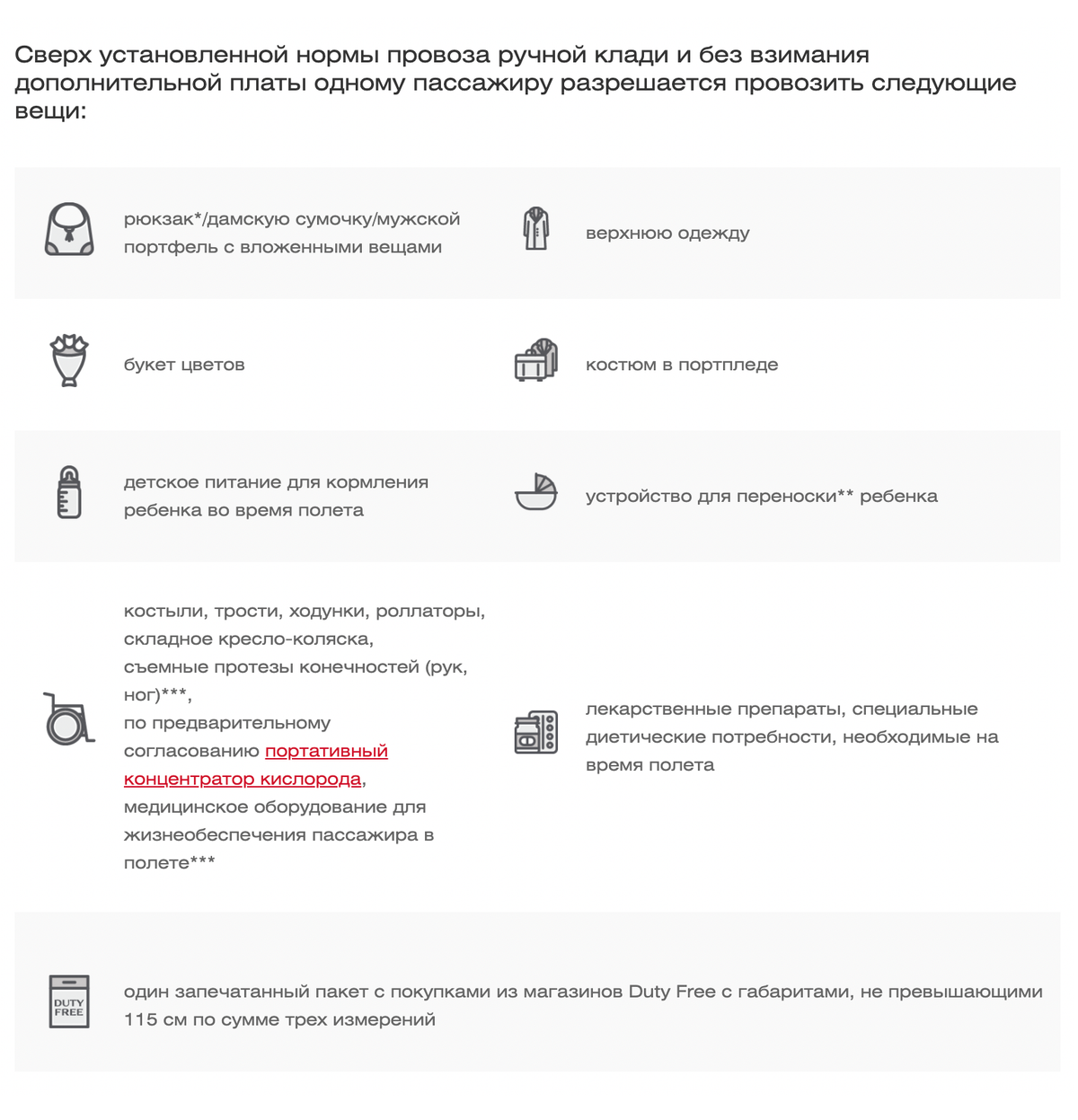 Пассажиры российских авиакомпаний имеют право провозить некоторые вещи в ручной клади сверх нормы и без доплаты. Перевозчик может ограничивать их размер — это законно.