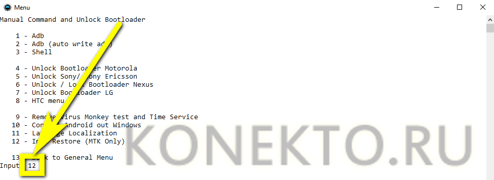 Теперь таким же образом заходим в раздел 12 (Восстановление IMEI – как следует из предупреждения, вариант подходит только для смартфонов на базе MTK).