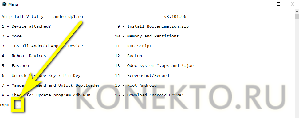 В открывшемся меню, что не может не порадовать любителя лаконичности, введите в командной строке цифру 7 (Ручная команда) и нажмите клавишу Enter.