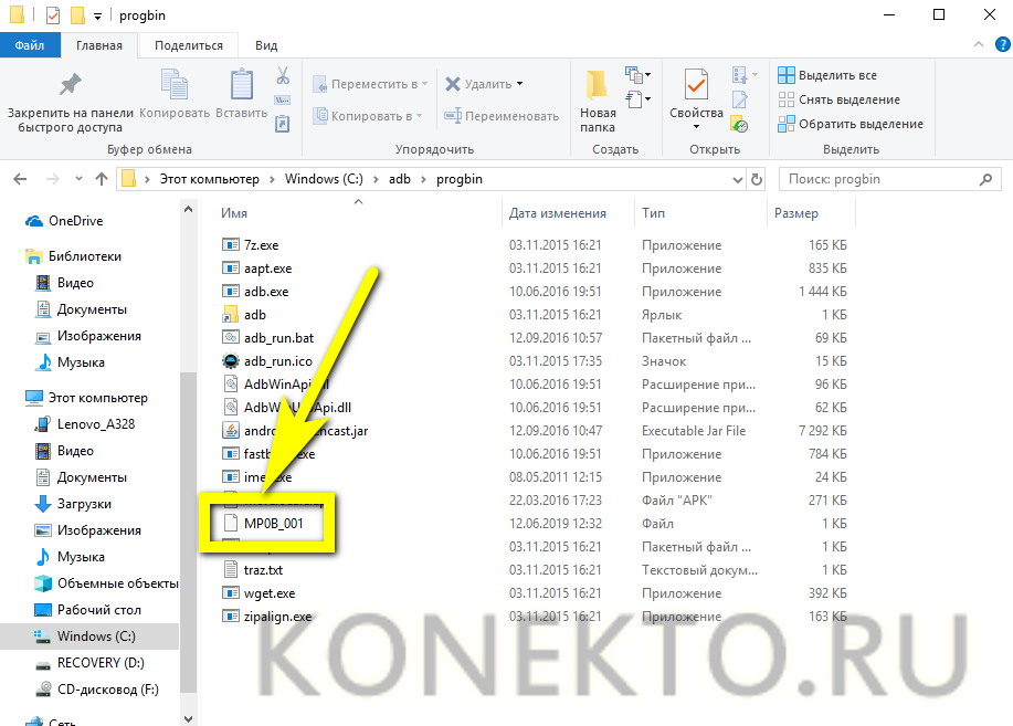 Программа сгенерирует файл без расширения MP0B_001. Чтобы найти его, пользователю необходимо открыть папку Adb Run, дважды щелкнув ярлык на рабочем столе, и перейти в каталог progbin. Еще один вариант оказаться в нужном месте — ввести адрес C:\adb\progbin в строку поиска Проводника.