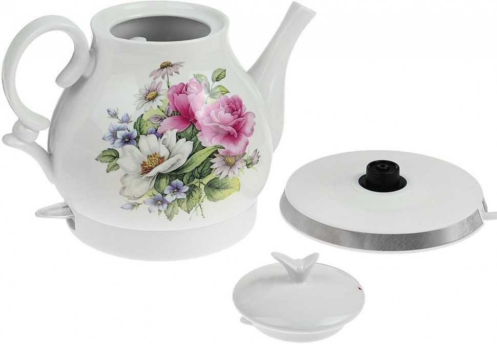 Хорошая китайская модель с узором на стекле. Единственный недостаток чайника – шумность, в остальном это надежный вариант, стоимость которого — 970 рублей. Изделие ориентировано на тех, кто не планирует постоянно пить чай. Нагревательный элемент выполнен из нержавеющей стали. Никакой функциональности здесь нет, так как продукт имеет низкую стоимость. Мощность – 2.2 кВт.