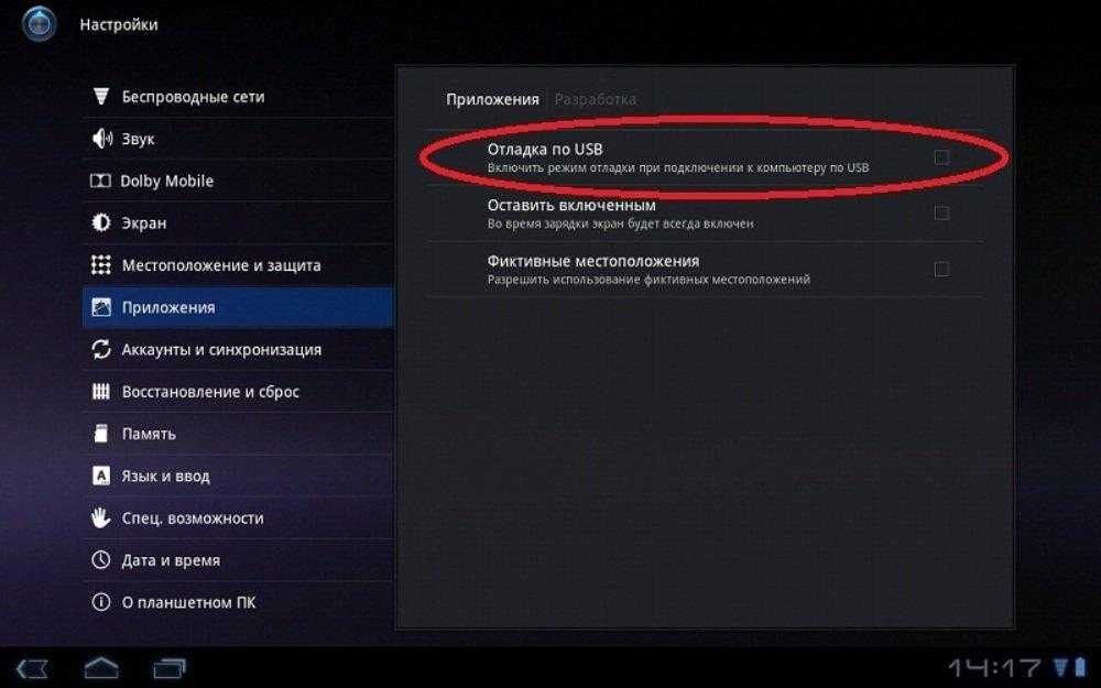 Выполните вход в системные настройки своего планшета и в разделе «Для разработчиков» включите режим отладки по USB. Если этой функции у вас нет, перейдите в меню «Об устройстве» и найдите строку с номером сборки — быстро нажмите на неё 5 раз подряд, после чего появится сообщение, что вы стали разработчиком, и функция отладки должна появиться в списке;